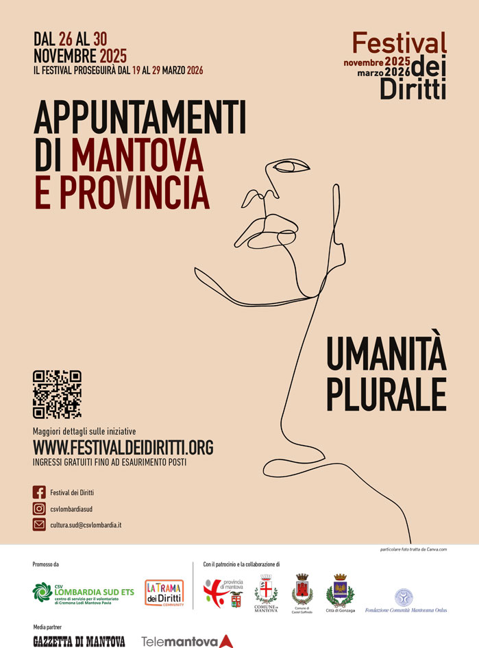 Festival dei Diritti – novembre 2025: “Umanità Plurale” – Appuntamenti Mantova e Provincia 17 Novembre 2025 News SCARICA IL PROGRAMMA Festival dei Diritti – novembre 2025: “Umanità Plurale” – Appuntamenti Mantova e Provincia