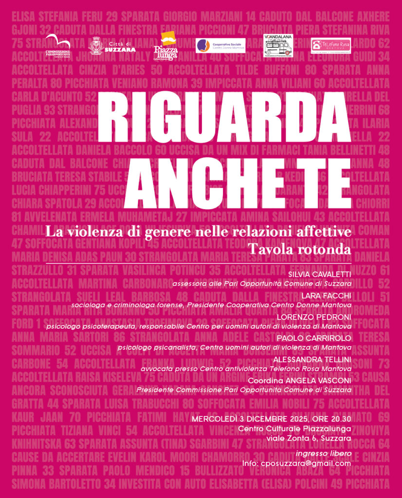 Giornata contro la violenza sulle donne – iniziative del Suzzarese 25 Novembre 2025 News 25 NOVEMBRE GIORNATA MONDIALE CONTRO LA VIOLENZA SULLE DONNE – PROVINCIA DI MANTOVA: Programma Giornata contro la violenza sulle donne – iniziative del Suzzarese